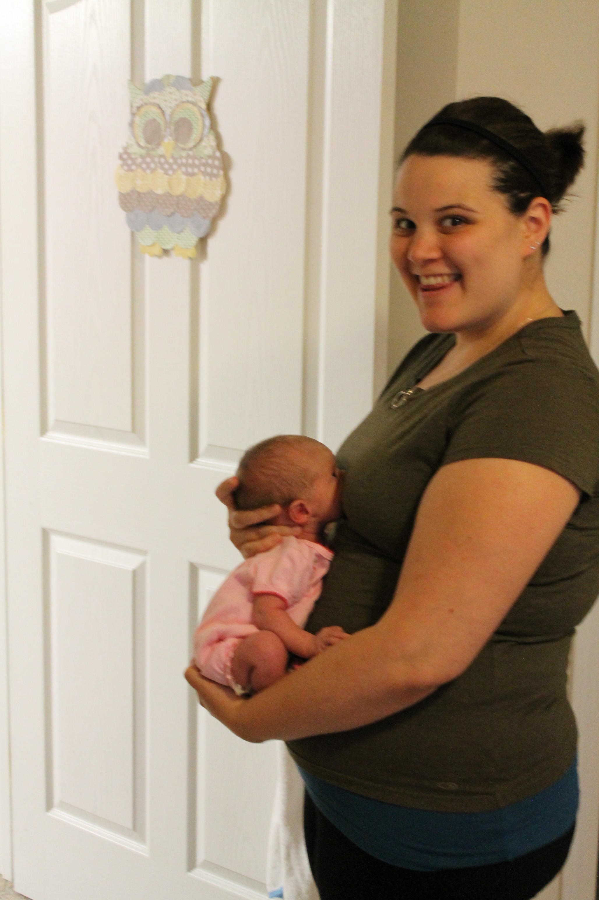 - 12:55p E and I snuggle on the couch and she eventually falls asleep on me. I take a little time to enjoy her on me but then move her to the Boppy so I can get some work done and pump again.
