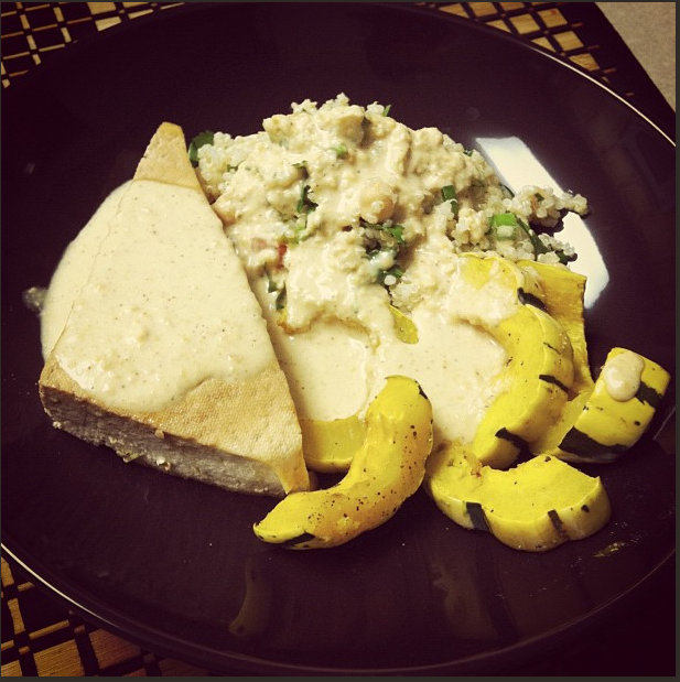 Today I am doing a Living Healthy on A Budget workshop and in preparation for the workshop I decided to make a quick, cheap and easy meal of chickpea-quinoa salad, tofu and squash with tahini sauce. What I loved about this meal was how easy it came together and how little work it was for me. It is also packed with nutrition and uber tasty.